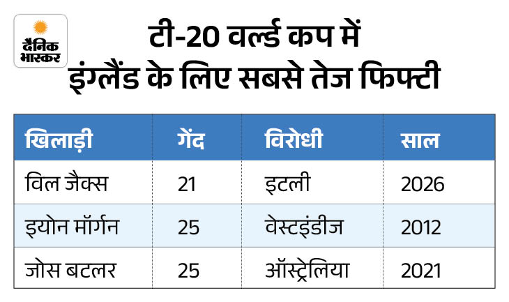 विल जैक्स ने इटली के खिलाफ 21 गेंद में फिफ्टी लगाकर इंग्लैंड के लिए टी-20 वर्ल्ड कप की सबसे तेज अर्धशतकीय पारी खेली। उन्होंने इयोन मॉर्गन और जोस बटलर के 25-25 गेंद वाले पुराने रिकॉर्ड को पीछे छोड़ दिया।
