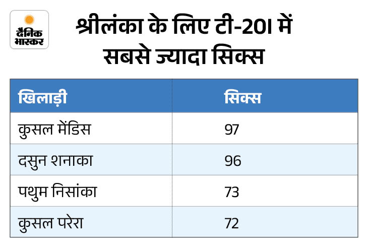 कुसल मेंडिस श्रीलंका के लिए टी-20 इंटरनेशनल में सबसे ज्यादा छक्के लगाने वाले बल्लेबाज बन गए हैं। उन्होंने 97 छक्के जड़ते हुए दसुन शनाका को पीछे छोड़ा।
