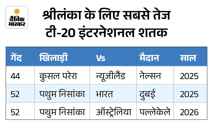 पथुम निसांका ने श्रीलंका के लिए टी-20 में तीसरी सबसे तेज सेंचुरी लगाने का रिकॉर्ड अपने नाम कर लिया। उन्होंने 52 गेंद में यह शतक पूरा किया। इस फॉर्मेट में श्रीलंका के लिए सबसे तेज शतक का रिकॉर्ड अब भी कुसल परेरा के नाम है, जिन्होंने 2025 में न्यूजीलैंड के खिलाफ नेल्सन में 44 गेंद में सेंचुरी ठोकी थी।