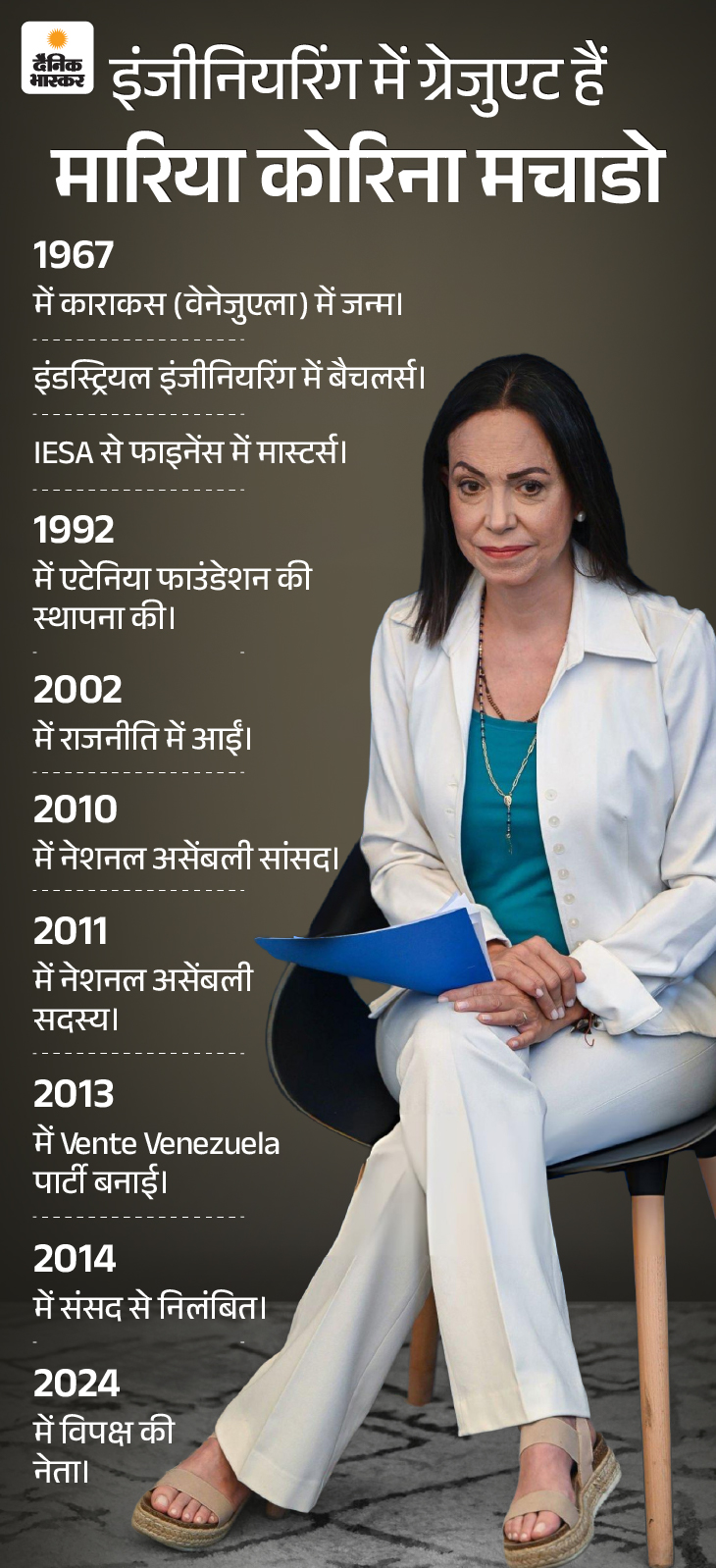इससे पहले मचाडो की बेटी एना ने ओस्लो में ही आयोजित अवॉर्ड सेरेमनी में नोबेल शांति पुरस्कार रिसीव किया। मचाडो सुरक्षा जोखिमों और यात्रा प्रतिबंधों के कारण कार्यक्रम में शामिल नहीं हो सकीं। ऐसे में उनकी जगह उनकी बेटी एना कोरीना सोसा मचाडो ने अवॉर्ड रिसीव किया।