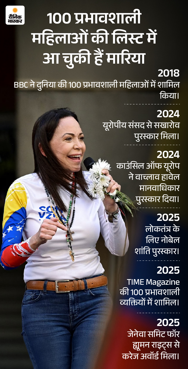 अक्टूबर 2025 में मचाडो को नोबेल शांति पुरस्कार से सम्मानित किया गया। उन्हें ‘वेनेजुएला के लोगों के लोकतांत्रिक अधिकारों के लिए उनके निरंतर प्रयासों और तानाशाही से लोकतंत्र की ओर शांतिपूर्ण और न्यायपूर्ण बदलाव की लड़ाई’ के लिए ये सम्मान मिला।