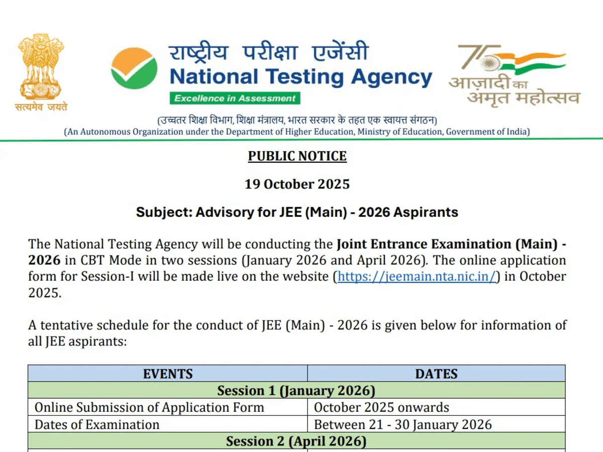 अक्टूबर से शुरू होंगे एप्लिकेशन पहले सेशन के लिए एप्लिकेशन प्रोसेस अक्टूबर 2025 में शुरू होगी। कैंडिडेट्स NTA की ऑफिशियल वेबसाइट jeemain.nta.ac.in पर जाकर रजिस्ट्रेशन कर पाएंगे। वहीं, दूसरे सेशन के लिए एप्लिकेशन विंडो जनवरी 2026 के अंतिम सप्ताह से खुलेगी।