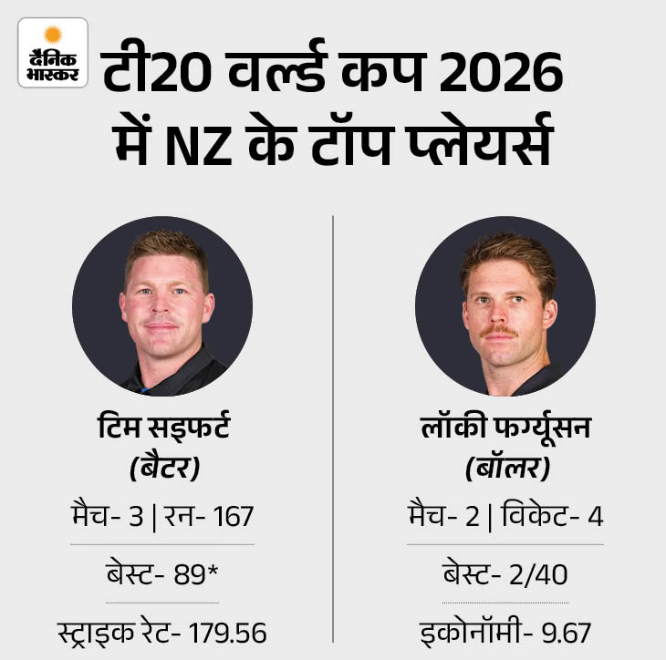 टिम साइफर्ट न्यूजीलैंड के लिए बेस्ट बैटर रहे इस वर्ल्ड कप में टिम सइफर्ट न्यूजीलैंड के टॉप स्कोरर रहे हैं। उन्होंने 3 मैचों में 179.57 की स्ट्राइक रेट से 167 रन बनाए हैं। इस दौरान 89* रन उनका बेस्ट स्कोर रहा है। बॉलिंग में लॉकी फर्ग्यूसन न्यूजीलैंड के टॉप विकेट टेकर रहे। उन्होंने 2 मैचों में 4 विकेट लिए। उनका बेस्ट प्रदर्शन 40 रन देकर 2 विकेट रहा है।