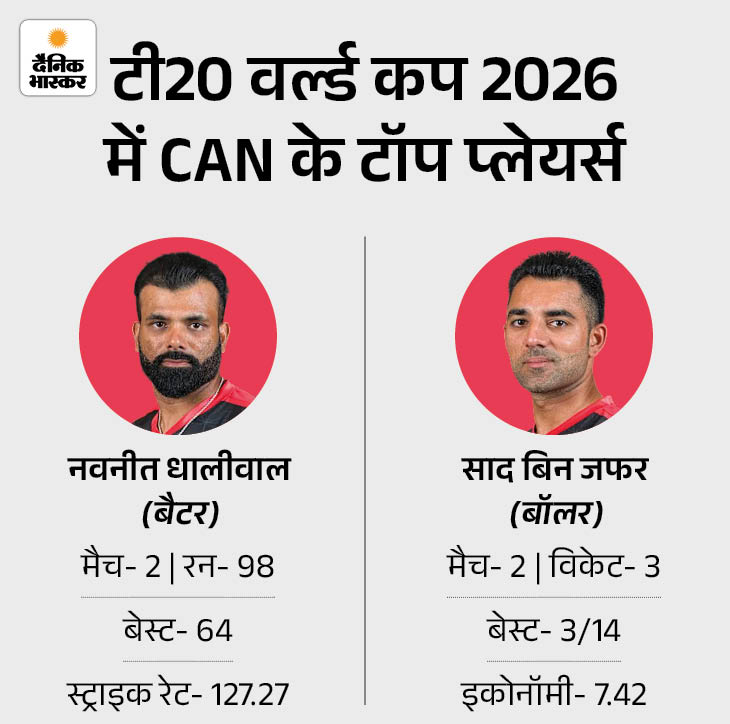 कनाडा से नवनीत धालीवाल पर निगाहें कनाडा के बैटर नवनीत धालीवाल टीम के टॉप स्कोरर रहे हैं। उन्होंने 2 मैचों में 127.27 की स्ट्राइक रेट से 98 रन बनाए हैं। इस दौरान 64 रन उनका बेस्ट स्कोर रहा। बॉलिंग में साद बिन जफर ने सबसे ज्यादा विकेट लिए हैं। उन्होंने 2 मैचों में 7.42 की इकोनॉमी से रन खर्च करते हुए 3 विकेट लिए।