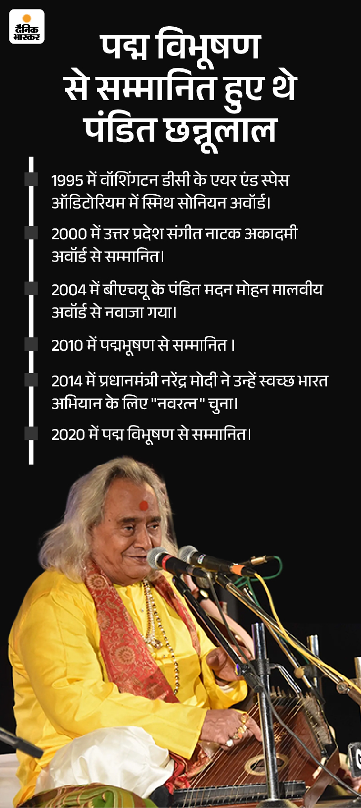 गुरुवार, 2 अक्टूबर कि सुबह पंडित छन्नूलाल मिश्र का निधन हो गया। वे पद्म विभूषण से नवाजे गए प्रसिद्ध हिन्दुस्तानी क्लासिकल गायक थे। वे 89 साल के थे। प्रधानमंत्री नरेंद्र मोदी ने सोशल मीडिया प्लेटफॉर्म X पर शोक जताते हुए कहा, ‘मैं उनके निधन की खबर सुन अत्यंत दुखी हुआ।’ श्रद्धांजलि देते हुए उन्होंने परिजनों के लिए संवेदना भी व्यक्त की।