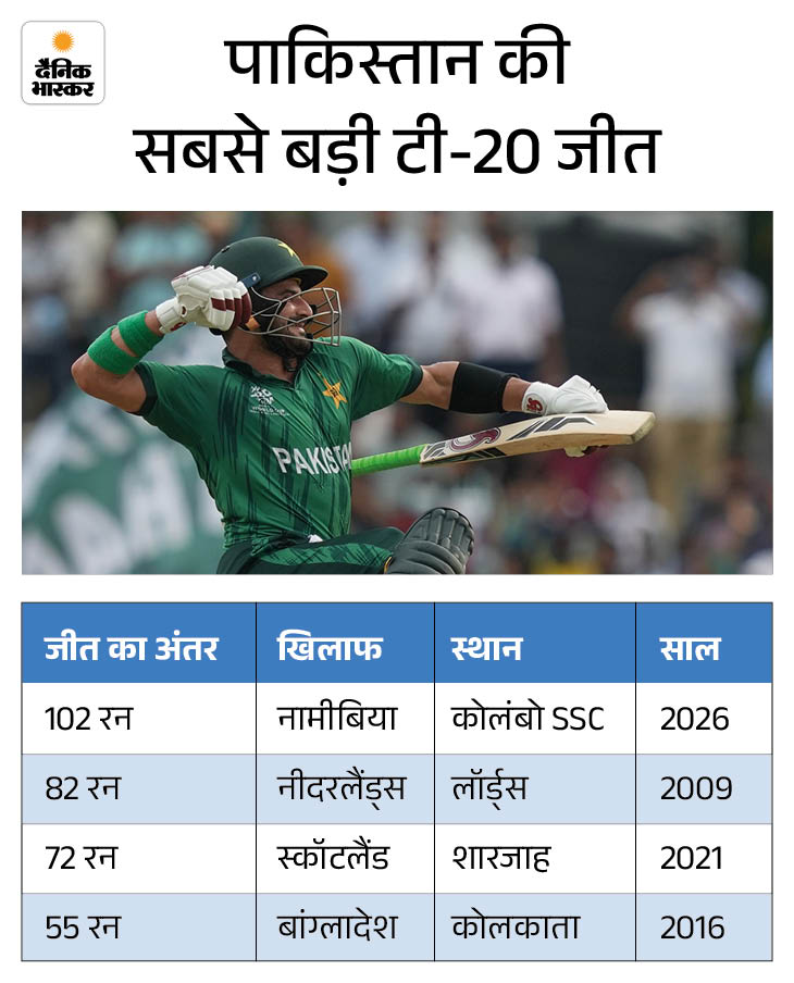 पाकिस्तान ने बुधवार को नामीबिया के खिलाफ 199 रन बनाने के बाद उन्हें 97 रन पर समेट दिया। टीम ने 102 रन से मुकाबला जीता। यह टी-20 वर्ल्ड कप में रन के अंतर से पाकिस्तान की सबसे बड़ी जीत रही। इससे पहले 2009 में टीम नीदरलैंड को लॉर्ड्स स्टेडियम में 82 रन से हरा चुकी है।