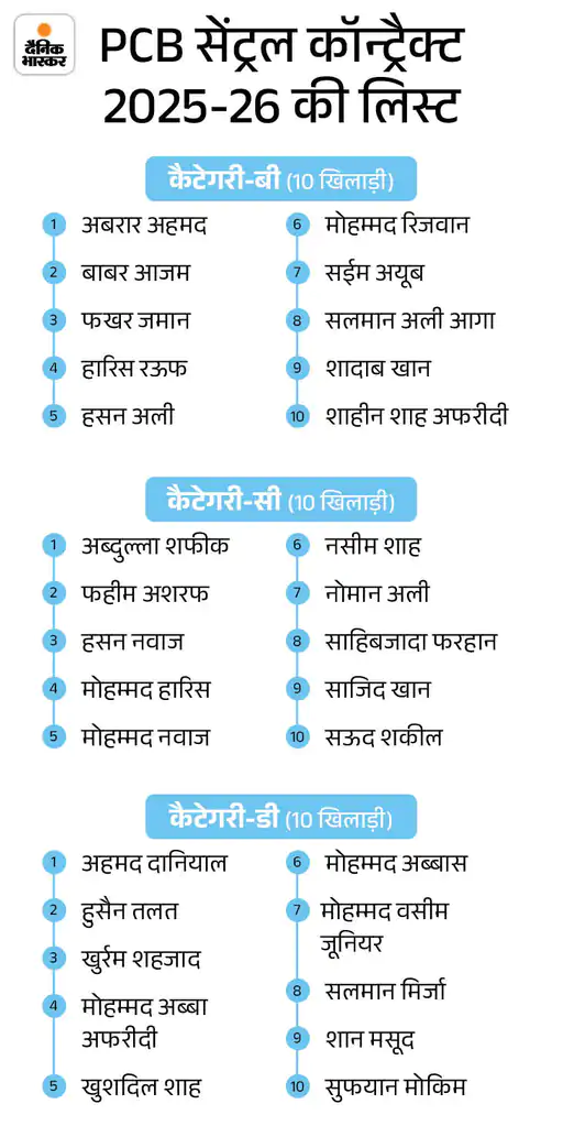 2025-26 सीजन के लिए जारी किए कॉन्ट्रेक्ट में खिलाड़ियों की संख्या 27 से बढ़ाकर 30 कर दी गई थी। युवा खिलाड़ी हसन नवाज, मोहम्मद हारिस और सुफियान मोकिम को 2025-26 सीजन के लिए सेंट्रल कॉन्ट्रैक्ट में शामिल किया गया था। तीनों कैटेगरी बी, सी और डी में 10-10 खिलाड़ियों को जगह दी गई थी। यह कॉन्ट्रैक्ट 1 जुलाइ 2025 से 30 जून 2026 तक रहेगा।