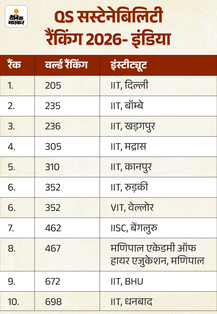 देश में IIT दिल्ली टॉप पर है। 2023 में जब ये रैंकिंग शुरु हुई थी उसके बाद से IIT दिल्ली का प्रदर्शन हर साल बेहतर हुआ है। सस्टेनेबिलिटी के साथ आगे बढ़ने वाली यूनिवर्सिटीज के मामले में IITs देश में सबसे आगे हैं। इस पूरी लिस्ट में कुल 15 IITs को शामिल किया गया है। इनमें 6 IITs की रैंकिंग में भी पिछले साल के मुकाबले सुधार हुआ है।
