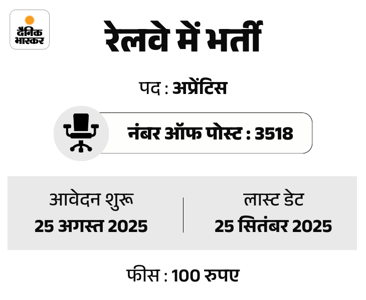 - Recruitment for 3518 Apprentice posts in Railway; Opportunity for 10th Pass, FEE is Rs 100