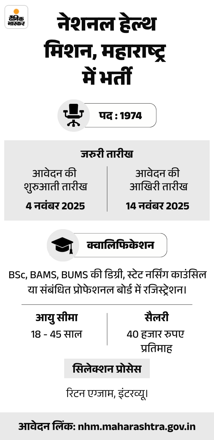 Recruitment for 8,477 teaching positions; NHM Maharashtra has 1,974 vacancies, with over 14,000 jobs announced this week. | हफ्ते की टॉप जॉब्स: ग्रेजुएट्स के लिए टीचर की 8477 वैकेंसी, PNB में स्‍पेशलिस्‍ट ऑफिसर्स की भर्तियां; इस हफ्ते निकलीं 14 हजार से ज्‍यादा नौकरियां
