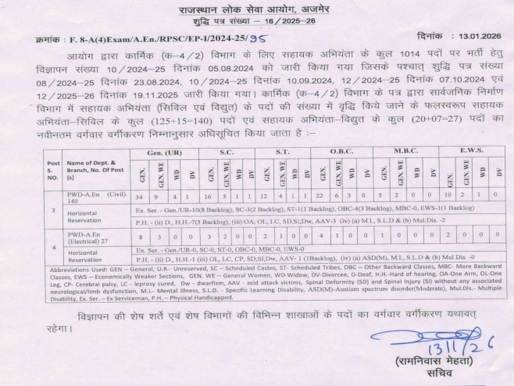 आयोग सचिव रामनिवास मेहता ने बताया- कार्मिक (क-4/2) विभाग के पत्र अनुसार में सहायक अभियंता के पदों की संख्या में वृद्धि की गई है। इसमें सहायक अभियंता (सिविल) के पूर्व विज्ञापित 125 पदों में 15 पदों की वृद्धि के साथ अब कुल 140 पद और सहायक अभियंता (विद्युत): पूर्व विज्ञापित 20 पदों में 7 पदों की वृद्धि के साथ अब कुल 27 पदों पर भर्ती होगी।