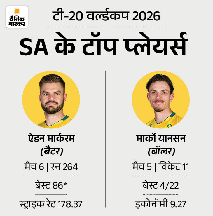 साउथ अफ्रीका के लिए ऐडन मार्करम ने इस टूर्नामेंट में सबसे ज्यादा रन बनाए हैं। उन्होंने 6 मैचों में 178.37 स्ट्राइक रेट से 264 रन बनाए। उनका बेस्ट स्कोर 86* रन रहा। वहीं, मार्को यानसन साउथ अफ्रीका के लिए टॅाप विकेट टेकर रहे। उन्होंने 5 मैचों में 9.27 की इकोनॅामी से 11 विकेट लिए।