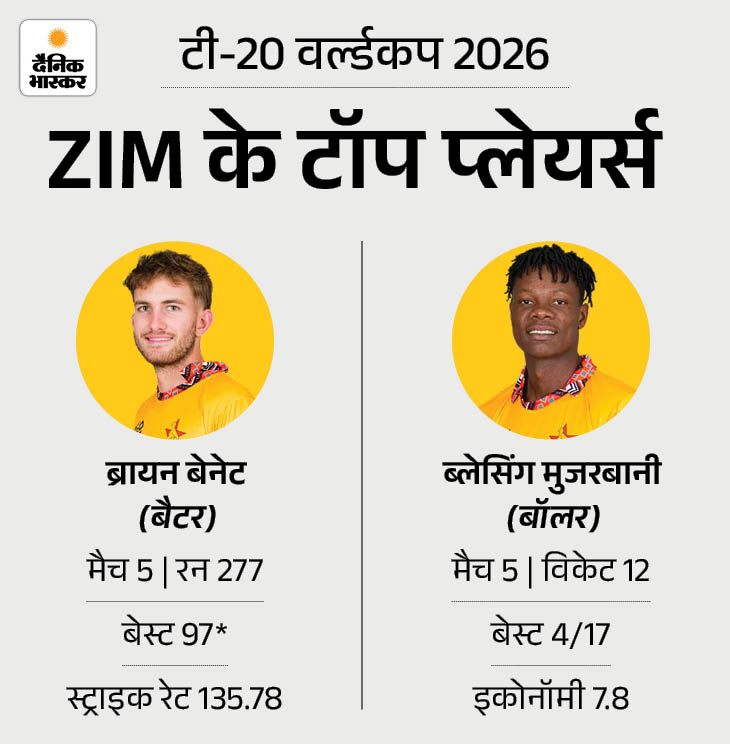 ब्रायन बेनेट ने टूर्नामेंट में जिम्बाब्वे के लिए सबसे ज्यादा रन बनाए हैं। उन्होंने मैचों में 135.78 के स्ट्राइक रेट से 277 रन बनाए। एक पारी में उनका बेस्ट नाबाद 97 रन रहा। वहीं, गेंदबाजी में ब्लेसिंग मुजरबानी टीम के लिए टॅाप विकेट टेकर रहे। उन्होंने 5 मैचों में 7.8 की इकोनॅामी से रन खर्च करते हुए 12 विकेट हासिल किए।