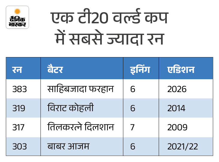 1. फरहान एक टी-20 वर्ल्डकप के टॉप स्कोरर पाकिस्तान के ओपनिंग बैट्समैन साहिबाजादा फरहान ने श्रीलंका के खिलाफ सेंचुरी लगाते हुए विराट कोहली का रिकॉर्ड तोड़ दिया। विराट कोहली के नाम टी20 वर्ल्ड कप के एक सीजन में सबसे ज्यादा रन बनाने का रिकॉर्ड था। विराट ने टी-20 वर्ल्ड कप 2014 में 6 पारियों में 319 रन बनाए थे। फरहान ने 6 पारियों में 383 रन बनाते हुए यह रिकॉर्ड अब अपने नाम कर लिया है।