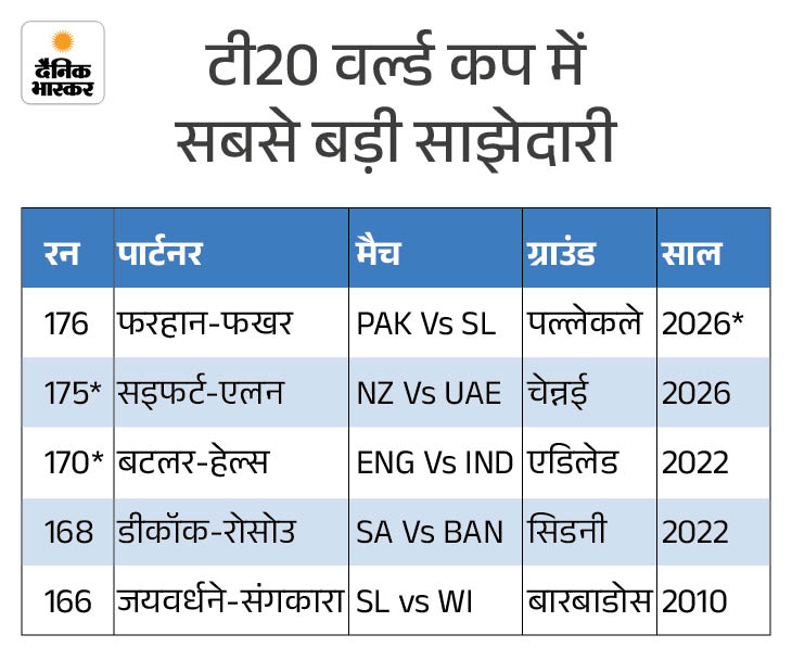 2. फरहान-फखर में टूर्नामेंट की बेस्ट साझेदारी पाकिस्तान के ओपनर्स साहिबजादा फरहान और फखर जमान ने शनिवार को पहले विकेट के लिए 176 रन की साझेदारी की। यह टी-20 वर्ल्ड कप के इतिहास में किसी भी विकेट के लिए सबसे बड़ी साझेदारी है। इससे पहले यह रिकॉर्ड न्यूजीलैंड के टिम सइफर्ट और फिन एलन के नाम था, जिन्होंने इसी साल यूएई के खिलाफ चेन्नई में पहले विकेट के लिए 175 रनों की नाबाद साझेदारी की थी।