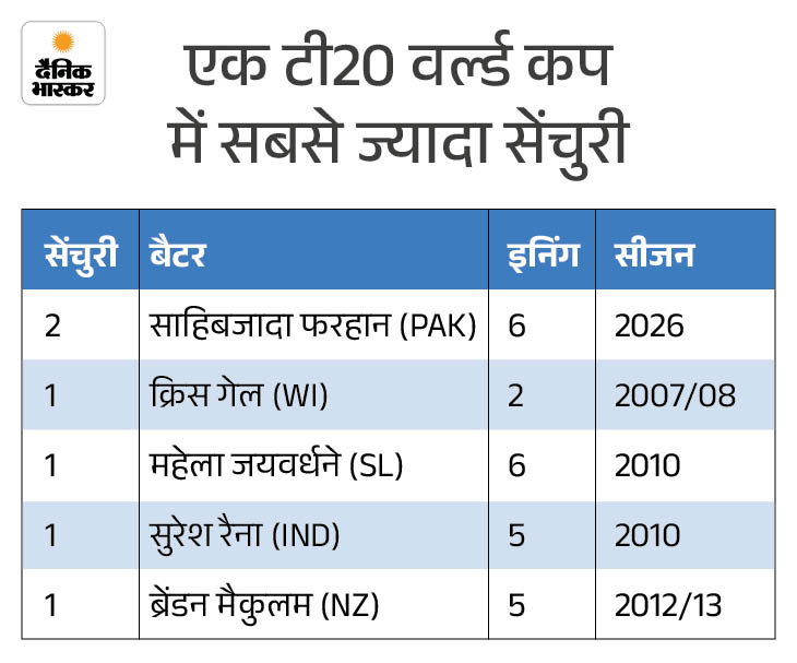 साहिबजादा फरहान ने इस मैच में 60 गेंदों पर शादार 100 रन बनाए। इसी के साथ वह एक टी-20 वर्ल्ड कप में सबसे ज्यादा शतक लगाने वाले बल्लेबाज बन गए हैं। इससे पहले उन्होंने इस टूर्नामेंट में नामीबिया के खिलाफ 18 फरवरी को 58 गेंद 100 रनों की नाबाद पारी खेली थी। उनसे पहले किसी भी बल्लेबाज ने टूर्नामेंट के एक एडीशन में 1 से ज्यादा शतक नहीं लगाए हैं।