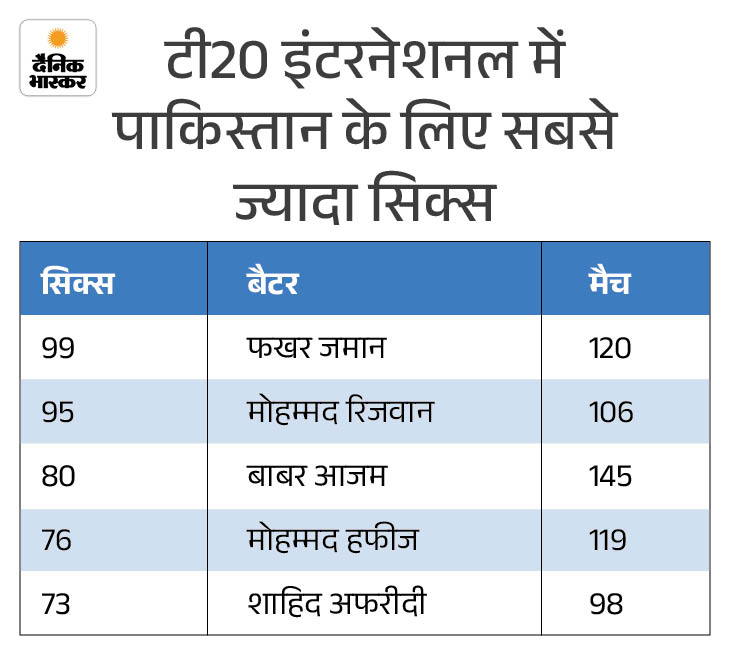 फखर जमान ने श्रीलंका के खिलाफ 4 छक्के लगाए। अब वह टी-20 इंटरनेशनल में पाकिस्तान के लिए सबसे ज्यादा छक्के लगाने वाले बल्लेबाज बन गए हैं। उनके नाम 120 टी-20 मैचों में 99 छक्के हैं। उन्होंने मोहम्मद रिजवान को पीछे छोड़ा, जिनके टी-20 में 95 छक्के लगाए हैं।