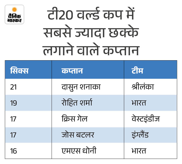 श्रीलंका के कप्तान दासुन शनाका ने शनिवार को पाकिस्तान के खिलाफ 76 रनों की नाबाद पारी में 8 छक्के लगाए। इसके साथ ही वह टी-20 वर्ल्ड कप के इतिहास में सबसे ज्यादा छक्के लगाने वाले कप्तान बन गए हैं। इससे पहले यह रिकॉर्ड भारत के 2024 वर्ल्ड कप विनिंग कप्तान रोहित शर्मा के नाम था। रोहित के नाम 19 छक्के छक्के हैं।
