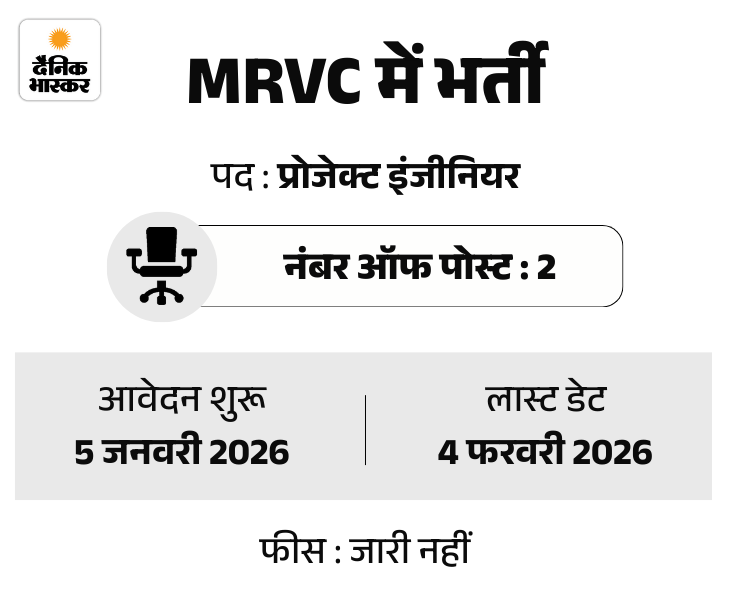 मुंबई रेलवे विकास कॉर्पोरेशन लिमिटेड यानी MRVC में प्रोजेक्ट इंजीनियर के 2 पदों पर भर्ती निकली है। उम्मीदवार 5 जनवरी से ऑफिशियल वेबसाइट mrvc.indianrailways.gov.in पर जाकर आवेदन की डीटेल्स चेक कर सकते हैं। इसमें आवेदन करने की आखिरी तारीख 4 फरवरी 2026 है। यह भर्ती कॉन्ट्रैक्ट बेसिस पर होगी।