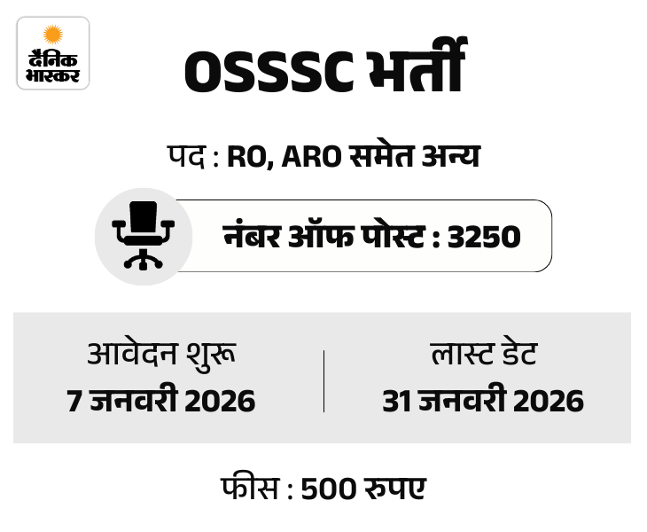 ओडिशा सब-ऑर्डिनेट स्टाफ सिलेक्शन कमीशन यानी OSSSC ने रेवेन्यू ऑफिसर और ICDS सुपरवाइजर समेत अन्य के 3250 पदों पर भर्ती निकाली है। उम्मीदवार ऑफिशियल वेबसाइट osssc.gov.in पर इस भर्ती की पूरी डिटेल्स चेक कर सकते हैं और ऑनलाइन आवेदन कर सकते हैं।