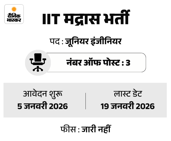 इंडियन इंस्टीट्यूट ऑफ टेक्नोलॉजी, मद्रास (IIT मद्रास) में जूनियर इंजीनियर के 3 पदों पर भर्ती के आवेदन शुरू किए हैं। उम्मीदवार 5 जनवरी से ऑफिशियल वेबसाइट iitm.ac.in पर जाकर आवेदन कर सकते हैं।