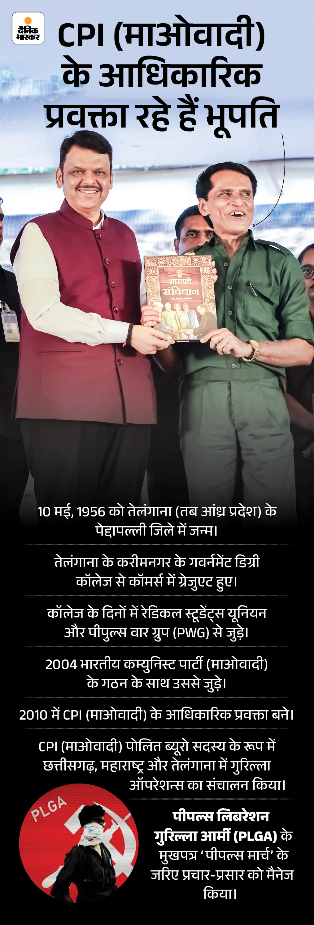 बुधवार, 15 अक्टूबर को भूपति, महाराष्ट्र के मुख्यमंत्री देवेंद्र फडणवीस के सामने गढ़चिरौली में औपचारिक रूप से आत्मसमर्पण किया।