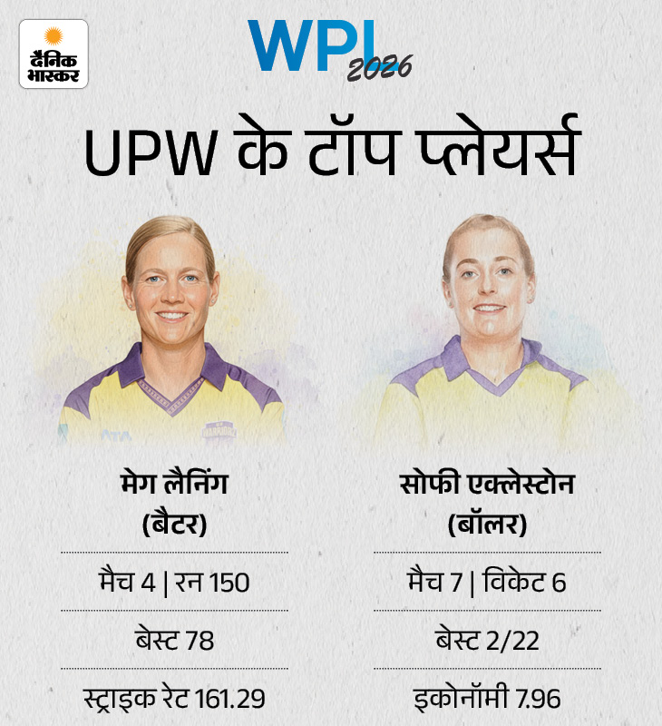 एक्लेस्टोन ने सबसे ज्यादा विकेट लिए WPL-2026 में यूपी वॉरियर्स के लिए मेग लैनिंग ने बल्लेबाजी का जिम्मा संभालते हुए शानदार निरंतरता दिखाई है। उन्होंने 7 मैचों में 248 रन बनाए हैं। गेंदबाजी में सोफी एक्लेस्टोन 7 मुकाबलों में 6 विकेट अपने नाम किए, जिसमें उनका बेस्ट प्रदर्शन 2/22 का रहा।