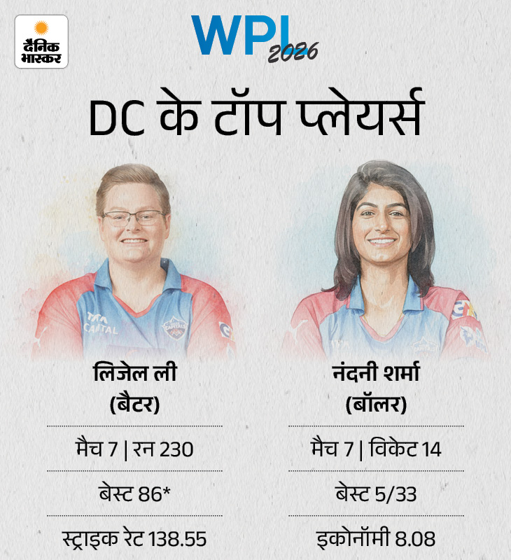लिजेल ली ने सबसे ज्यादा रन बनाए WPL-2026 में दिल्ली कैपिटल्स की कामयाबी में उसके स्टार खिलाड़ियों का अहम योगदान रहा है। लिजेल ली ने बल्लेबाजी में टीम की अगुवाई करते हुए 7 मैचों में 230 रन बनाए हैं। वहीं गेंदबाजी में नंदनी शर्मा DC की सबसे प्रभावी बॉलर साबित हुई हैं। उन्होंने 7 मैचों में 14 विकेट झटके हैं।