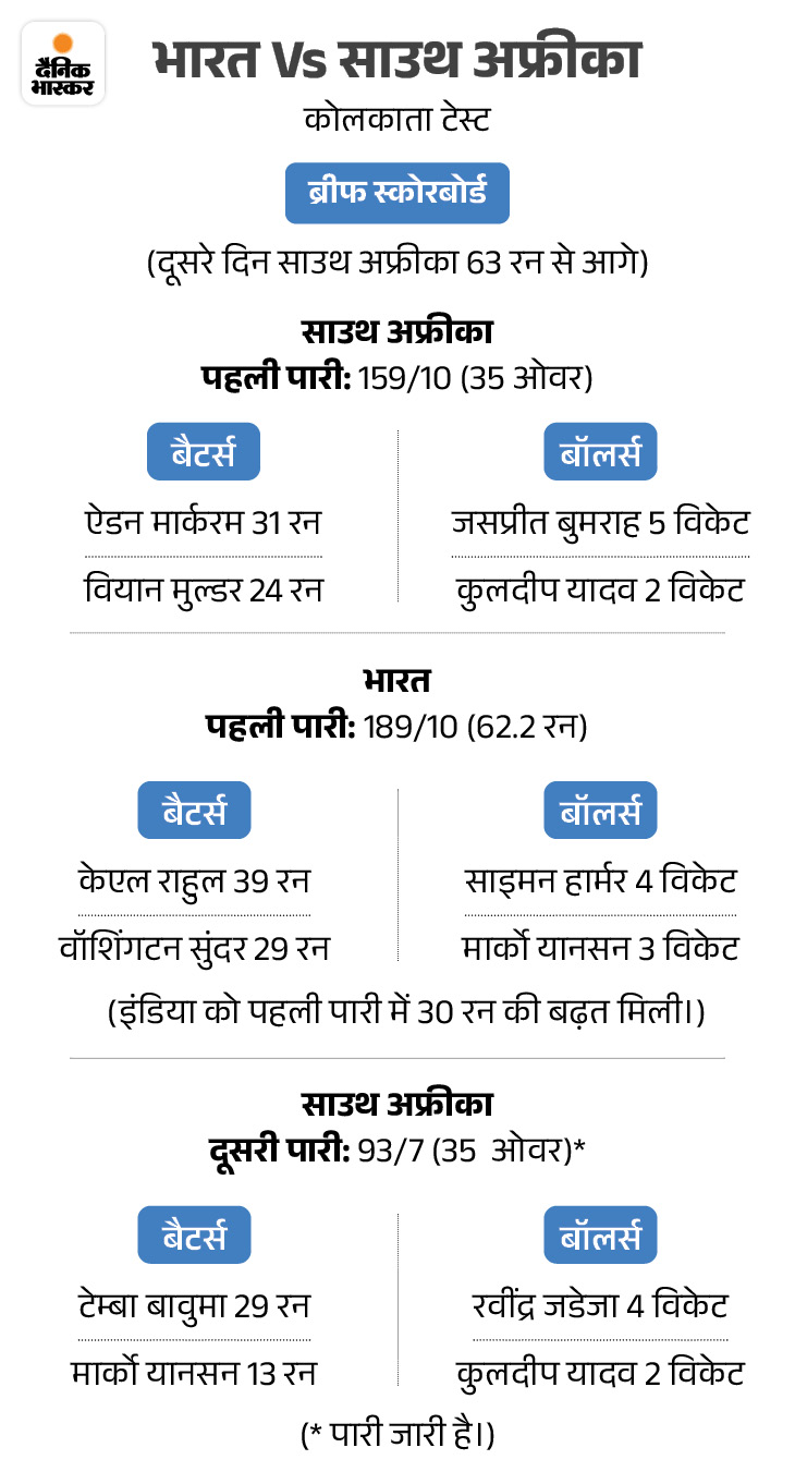 भारत और साउथ अफ्रीका के बीच टेस्ट सीरीज का पहला मुकाबला कोलकाता में खेला जा रहा है। रविवार को तीसरे दिन का खेल होगा। फिलहाल, साउथ अफ्रीकन भारत से 63 रन आगे है। 93 रन पर टीम के 7 बैटर्स पवेलियन लौट चुके हैं। आज कप्तान टेम्बा बावुमा 29 और कॉर्बिन बॉश एक रन से अपनी-अपनी पारी को आगे बढ़ाएंगे।