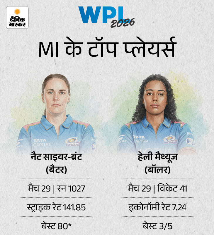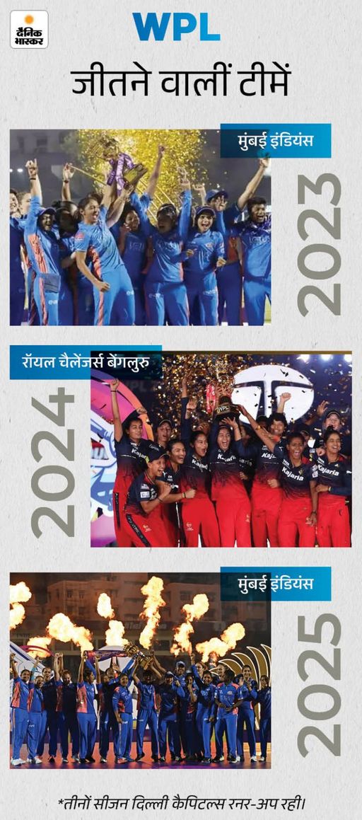 WPL के अब तक 3 सीजन हो चुके हैं। 2 बार मुंबई ने खिताब जीता। जबकि, एक बार बेंगलुरु भी चैंपियन बनी। दिल्ली कैपिटल्स तीनों सीजन फाइनल तक पहुंची, लेकिन रनर-अप ही रही।