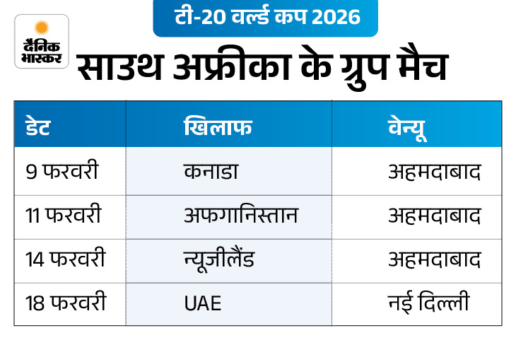 साउथ अफ्रीका की टीम 9 फरवरी को कनाडा के खिलाफ अहमदाबाद में अपने अभियान का आगाज करेगी।