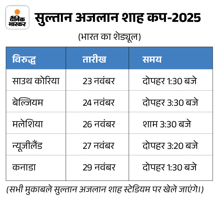 टीम इंडिया 23 नवंबर को साउथ कोरिया के खिलाफ अपने अभियान की शुरुआत करेगी। भारत के सभी मुकाबले सुल्तान अजलान शाह स्टेडियम पर खेले जाएंगे। यह टूर्नामेंट राउंड-रॉबिन फॉर्मेट में खेला जाएगा, इसमें टॉप-2 टीमें 30 नवंबर को फाइनल खेलेंगी।