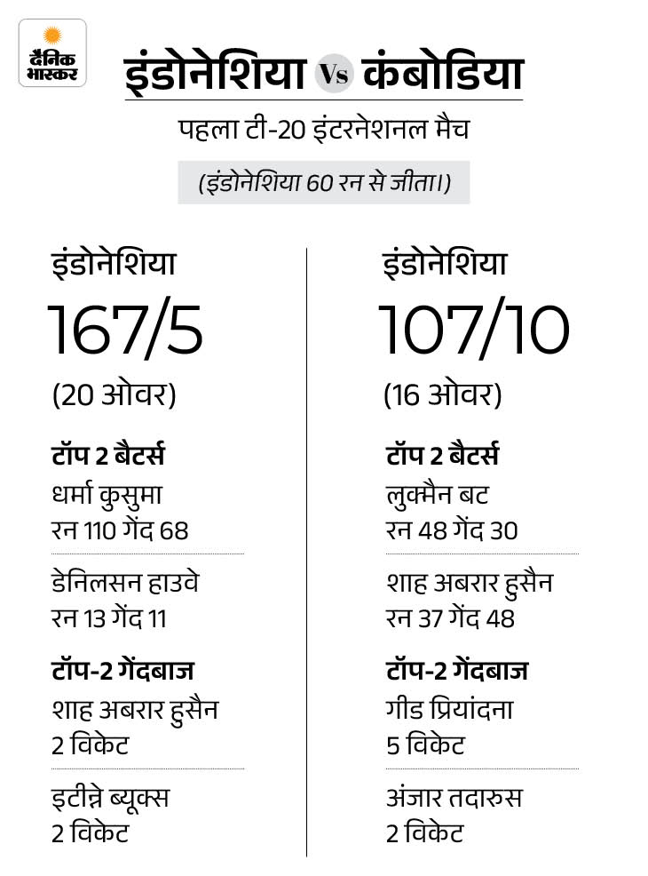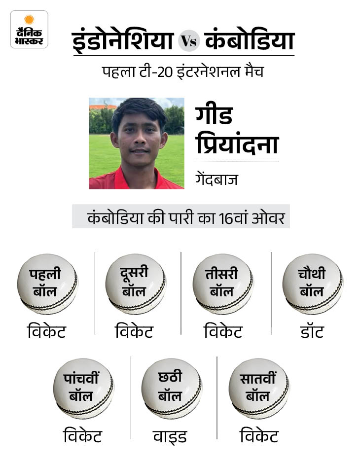 ओवर में 5 विकेट कैसे लिए? प्रियांदना ने 167 रन का स्कोर डिफेंड कर रही इंडोनेशिया की ओर से 16वां ओवर डालने आए। उन्होंने पहली तीन गेंदों पर लगातार विकेट लेकर हैट्रिक पूरी की। प्रियांदना ने शाह अबरार हुसैन, निर्मलजीत सिंह और चंथोउन रथानक को पवेलियन भेजा।