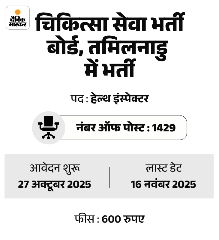 चिकित्सा सेवा भर्ती बोर्ड (MRB), तमिलनाडु ने हेल्थ इंस्पेक्टर के 1429 पदों पर भर्ती निकाली है। उम्मीदवार ऑफिशियल वेबसाइट mrb.tn.gov.in पर जाकर आवेदन कर सकते हैं।