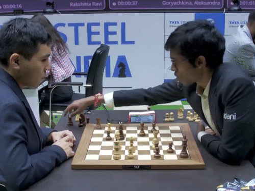 पांच बार के विश्व चैंपियन विश्वनाथन आनंद और अर्जुन एरिगैसी मैच के दौरान।