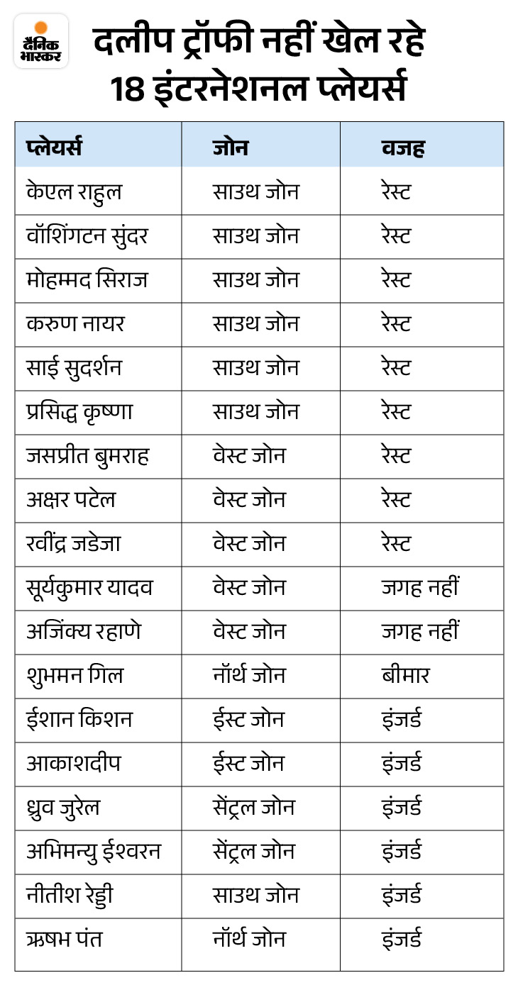 Which star players are not playing the Duleep Trophy this time? Players of Team India like KL Rahul, Washington Sundar, Mohammad Siraj, Jaspreet Bumrah, Akshar Patel, Suryakumar Yadav, Ravindra Jadeja, Karun Nair, Sai Sudarshan and the famous Krishna are not playing domestic tournaments. All are fit. All the players except Akshar, Surya and Hardik were also part of the team during the Test series in England. Despite this, they were not included in the squad of the Dalip Trophy. While the team’s Test captain Shubman Gill was also given the command of North Zone. However, he could not play the match due to illness.
