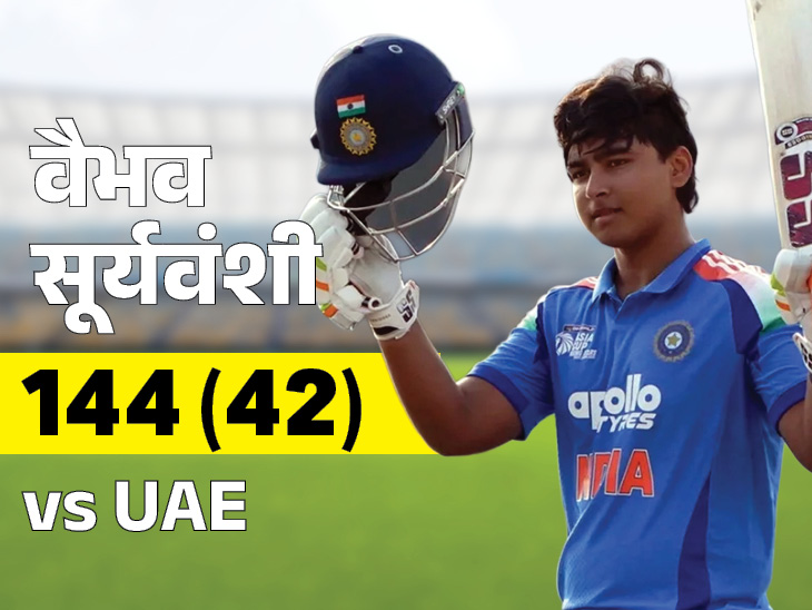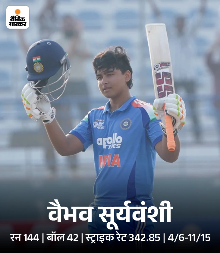 वैभव IPL में शतक लगाने वाले सबसे युवा प्लेयर बने थे। उन्होंने अब महज 32 गेंद पर शतक लगा दिया। यह टी-20 में उनकी सबसे तेज सेंचुरी रही। भारत से उर्विल पटेल और अभिषेक शर्मा 28-28 गेंद पर शतक लगा चुके हैं। ऋषभ पंत ने 32 गेंद पर शतक लगाया था, वैभव ने अब भारतीय प्लेयर्स में उनकी बराबरी कर ली। इंटरनेशनल क्रिकेट में एस्टोनिया के साहिल चौहान 27 गेंद पर शतक लगा चुके हैं।