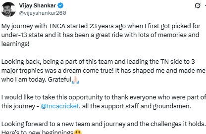 Tamil Nadu all-rounder Vijay Shankar has decided to leave his home State Tamil Nadu before the 2025-26 domestic season. The 34-year-old Vijay has been given a No-Objection Certificate (NOC) by the Tamil Nadu Cricket Association (NOC). Vijay recently played against Himachal Pradesh for TNCA Presidents XI in the first round of the Buchi Babu tournament in Chennai, but he was out of the team against Maharashtra. Subsequently, he decided to change the state to get more opportunities in all formats.