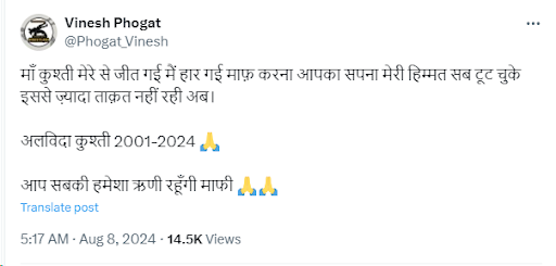 डिसक्वालिफाई होने के 17 घंटे बाद विनेश ने कुश्ती से संन्यास का ऐलान कर दिया था। उन्होंने अल सुबह 5.17 बजे X पर एक पोस्ट में लिखा था- “मां कुश्ती मेरे से जीत गई, मैं हार गई। माफ करना आपका सपना, मेरी हिम्मत सब टूट चुके। इससे ज्यादा ताकत नहीं रही अब। अलविदा कुश्ती 2001-2024, आप सबकी हमेशा ऋणी रहूंगी, माफी।” विनेश के डिसक्वालिफाई होने की खबर 7 अगस्त 2024 को दोपहर करीब 12 बजे आई थी।