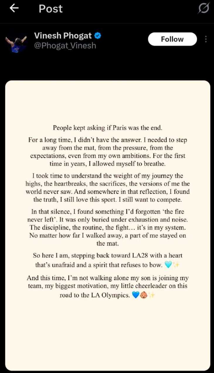 इस बार मैं अकेली नहीं चल रही हूं : उन्होंने आगे लिखा- उस खामोशी में मुझे कुछ ऐसा मिला जिसे मैं भूल गई थी ‘आग कभी खत्म नहीं होती’। यह सिर्फ थकान और शोर के नीचे दब गया था। डिसिप्लिन, रूटीन, लड़ाई… यह सब मेरे सिस्टम में है। मैं कितना भी दूर चली जाऊं, मेरा एक हिस्सा मैट पर बना रहा। तो मैं यहां हूं, LA28 की ओर एक ऐसे दिल के साथ वापस कदम बढ़ा रही हूं जो निडर है और एक ऐसी भावना जो झुकने से मना करती है। और इस बार मैं अकेली नहीं चल रही हूं, मेरा बेटा मेरी टीम, मेरी सबसे बड़ी प्रेरणा, LA ओलिंपिक के इस रास्ते पर मेरे छोटे चीयरलीडर के साथ शामिल हो रहा है।