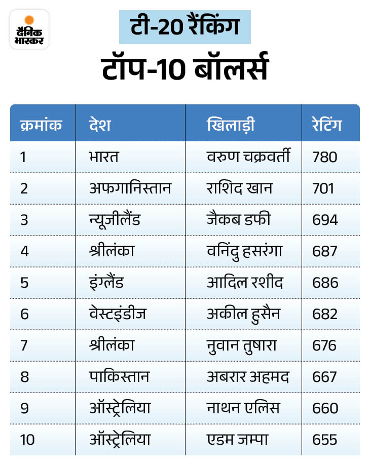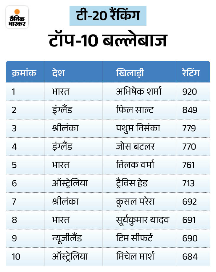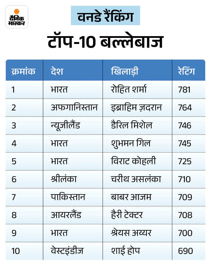 रोहित शर्मा (781 अंक) के साथ पहले और कप्तान शुभमन गिल (745 अंक) चौथे स्थान पर हैं। इसके अलावा, टी-20 बैटर्स की रैंकिंग में तिलक वर्मा को दो स्थान का नुकसान हुआ है। वे 761 अंक के साथ 5वें नंबर पर आ गए हैं। श्रीलंका के पथुम निसांका (779 अंक) तीसरे और जोस बटलर (770 अंक) चौथे स्थान पर हैं।