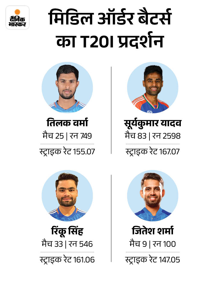 Tilak will be out if Samson landed on number-3 If Abhishek and Shubman get off the opening, Samson can be launched on number-3. Because if any one had to choose as wicketkeeper batter in Samson and Jitesh, then the management will give priority to Samson, who has scored 3 centuries. However, Tilak is at number-2 in the T20 batter rankings and it will be difficult to exclude them.