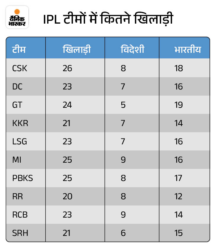 मुंबई और पिछली रनर-अप पंजाब किंग्स का स्क्वॉड 25-25 मेंबर्स का है। वहीं चेन्नई सुपर किंग्स में सबसे ज्यादा 26 खिलाड़ी हैं। राजस्थान, कोलकाता और हैदराबाद ने पिछले सीजन सबसे कम 20-21 प्लेयर्स ही खरीदे थे। इसके बावजूद तीनों टीमें ऑक्शन से पहले ज्यादातर प्लयेर्स को रिलीज कर सकती हैं।
