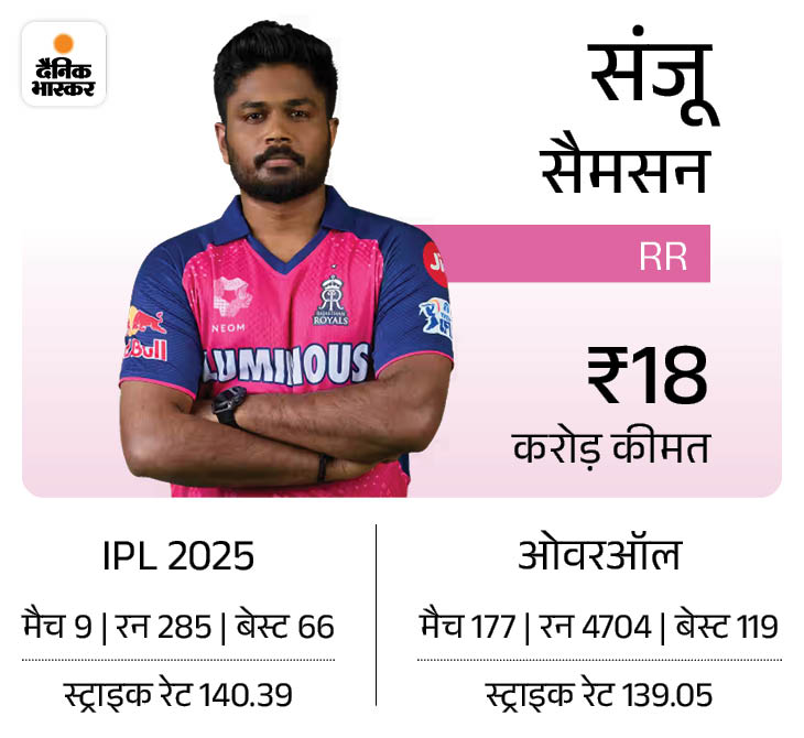 राजस्थान रॉयल्स के कप्तान और विकेटकीपर संजू सैमसन को टीम ने 18 करोड़ रुपए में रिटेन किया था। पिछले सीजन इंजरी के कारण वे 9 मैच ही खेल सके। उनकी जगह रियान पराग ने कप्तानी और युवा वैभव सूर्यवंशी ने ओपनिंग की जिम्मेदारी संभाली। सैमसन ने बैट से ठीक-ठाक प्रदर्शन किया, लेकिन टीम 9वें नंबर पर रही।