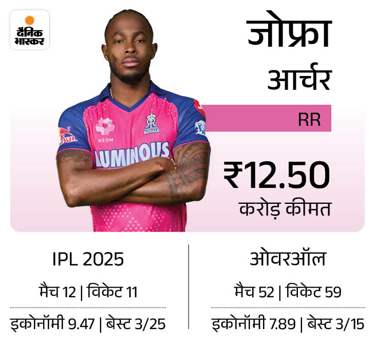 आर्चर इंजरी से जूझते रहते हैं, ऐसे में राजस्थान उन्हें रिलीज कर सकती है। जोफ्रा को रिलीज करने से टीम के पर्स में ज्यादा पैसे आएंगे, इससे RR विदेशी तेज गेंदबाजों को खरीद सकती है। RR का मिडिल ऑर्डर भी कमजोर है, टीम इन पैसों का इस्तेमाल बल्लेबाजी को मजबूत करने के लिए भी कर सकती है।