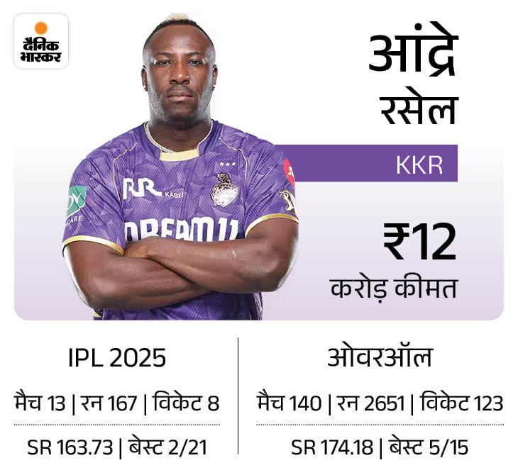 कोलकाता नाइट राइडर्स ने ऑलराउंडर आंद्रे रसेल को 12 करोड़ रुपए में रिटेन किया था। वे पिछले सीजन 13 मैच में 167 रन ही बना सके। गेंदबाजी में भी वे 8 विकेट ही ले पाए। रसेल IPL में 175 से ज्यादा के स्ट्राइक रेट से बैटिंग करते हैं और जरूरत पड़ने पर अपनी टीम को विकेट भी दिलाते हैं।