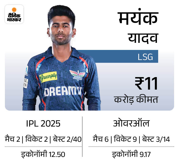 लगातार 150 किमी प्रति घंटे से ज्यादा की रफ्तार से गेंदबाजी करने वाले मयंक यादव को लखनऊ सुपरजायंट्स ने 11 करोड़ रुपए में रिटेन किया था। वे इंजरी से जूझने के कारण पिछले सीजन 2 ही मैच खेल सके, इनमें वे 2 विकेट ही ले सके। उनकी इकोनॉमी भी 12.50 की रही। टीम भी प्लेऑफ में जगह नहीं बना सकी।