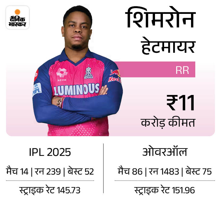 वेस्टइंडीज के लेफ्ट हैंड बैटर शिमरोन हेटमायर को राजस्थान ने 11 करोड़ रुपए में रिटेन किया था। उन्हें टीम ने फिनिशिंग मजबूत करने के लिए रखा था, लेकिन वे इस काम को बखूबी निभा नहीं पाए। पिछले सीजन वे 14 मुकाबलों में 145 के स्ट्राइक रेट से 239 रन ही बना सके। टीम कई मुकाबलों में उनके पिच पर होने के बावजूद रन चेज नहीं कर सकी।