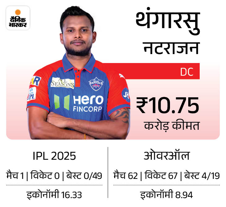 लेफ्ट आर्म पेसर थंगारसु नटराजन को दिल्ली कैपिटल्स ने 10.75 करोड़ रुपए में खरीदा था। नटराजन मिडिल और डेथ ओवर्स में गेंदबाजी करते हैं और वैरिएशन से टीम को विकेट दिलाते हैं। इसके बावजूद पिछले सीजन उन्हें एक ही मुकाबला खिलाया गया। जिसमें उन्हें कोई विकेट नहीं मिला। वे करियर में 67 IPL विकेट ले चुके हैं।