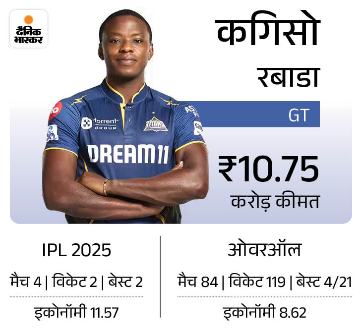 साउथ अफ्रीका के तेज गेंदबाज कगिसो रबाडा को गुजरात टाइटंस ने मेगा ऑक्शन में 10.75 करोड़ रुपए में खरीदा। वे ICC के कोड ऑफ कंडक्ट में दोषी पाए जाने के कारण क्रिकेट से बैन कर दिए गए। हालांकि, उन्होंने 4 मैच जरूर खेले, लेकिन इनमें 2 विकेट ही ले सके। उनकी इकोनॉमी भी 11 से ज्यादा की रही।